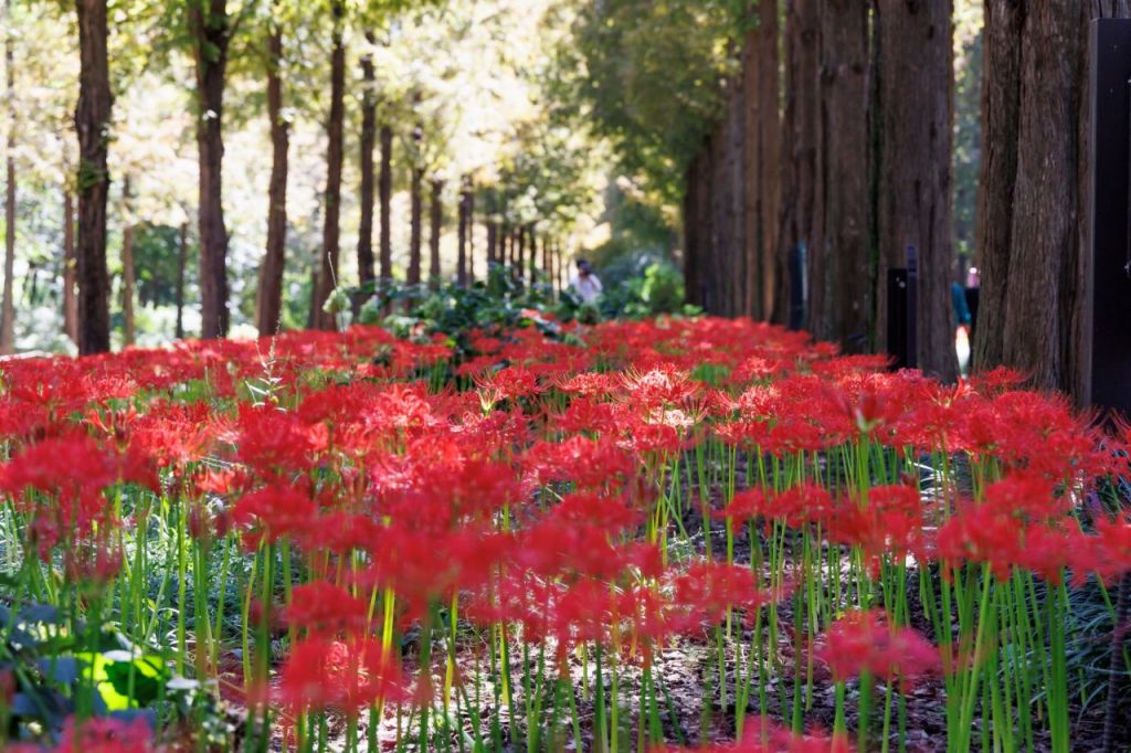 파란 하늘 아래 초록빛 메타세쿼이아 숲길을 배경으로 붉게 핀 상사화 군락은 방문객들의 눈길을 사로잡는다. 붉은 우산을 펼친 듯 겹쳐진 상사화 꽃잎은 로맨틱한 가을의 추억을 더 한다.