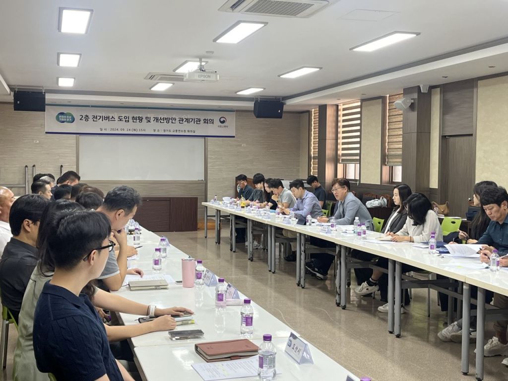 경기도는 지난 24일 대도시권광역교통위원회, 시군 관계자 및 운송업체, 전기버스 제조사인 현대자동차와 ‘2층 전기버스 개선방안’ 간담회를 개최하고 있다. <사진=경기도>