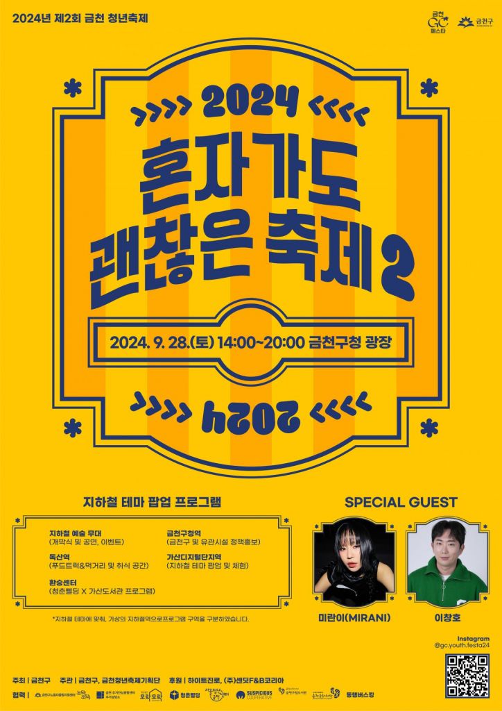 금천구(구청장 유성훈)는 9월 28일 오후 2시부터 구청 광장에서 금천 청년축제 ‘혼자 가도 괜찮은 축제 2’를 개최한다고 밝혔다.