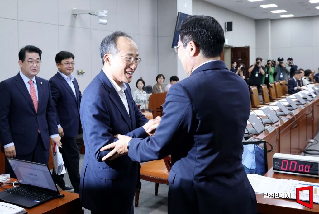 박찬대 국회 운영위원장과 추경호 국민의힘 원내대표가 25일 국회에서 열린 운영위원회 전체회의에서 만나 인사하고 있다. 사진=김현민 기자 kimhyun81@