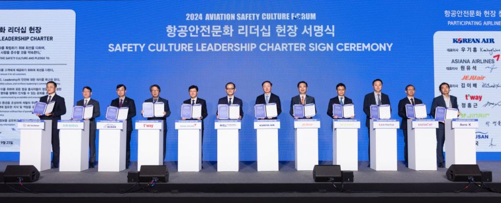25일 대한항공은 인천 중구 그랜드하얏트인천에서 열린 '2024 항공안전문화포럼'에서 국토교통부, 한국항공대학교, 국적 항공사와 함께 항공안전문화를 개선하고 선제적 안전관리 패러다임 구축을 결의했다고 밝혔다. 이날 우기홍 대한항공 사장을 비롯한 국내 11개 항공사 CEO들과 허희영 한국항공대 총장은 이 자리에서 ‘항공안전문화 리더십 헌장’에 서명했다.