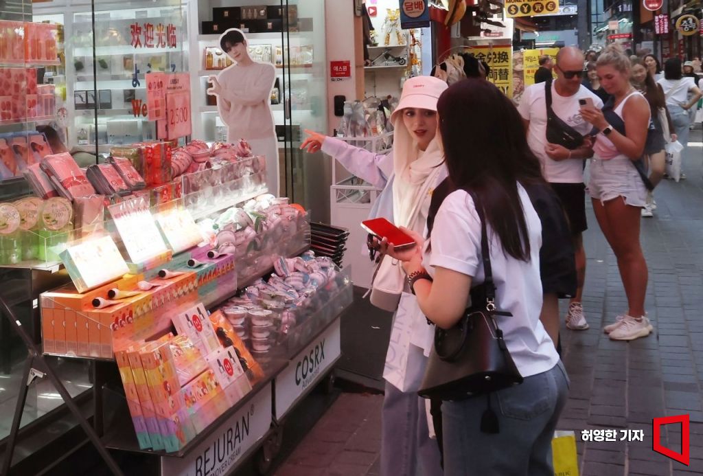 서울 명동의 화장품 가게 앞에서 외국인들이 화장품을 구경하고 있다. 사진=허영한 기자 younghan@