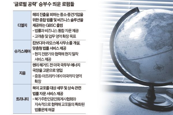 국내 법률시장이 포화 상태에 이르면서, 혁신적인 중소형 로펌들이 글로벌 시장 공략을 ‘승부수’로 성장을 꾀하고 있다. 국내 중견·중소기업의 경우 해외 진출 시 현지 법률과 규제에 부닥치게 되는데, 자체 법무팀 부재와 대형 로펌의 높은 수임료로 어려움을 겪고 있다. 이런 수요를 겨냥해 맞춤형 법률 서비스를 제공하며 새로운 기회를 창출하려는 것이다.