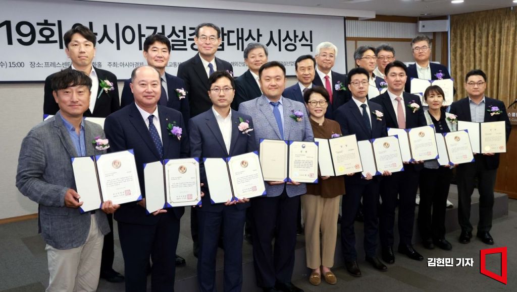 25일 서울 중구 프레스센터에서 열린 제19회 아시아건설종합대상 시상식에서 우병현 아시아경제 대표를 비롯한 내빈과 각 부문 수상자들이 기념촬영를 하고 있다. 사진=김현민 기자 kimhyun81@