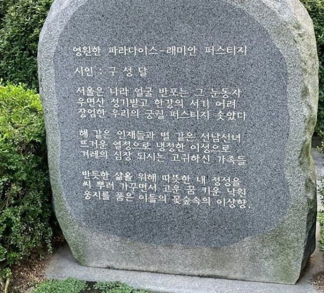 최근 여러 온라인 커뮤니티에는 한 아파트 내부에 놓인 비석 사진이 공유됐다. 해당 비석은 서울 서초구 래미안 퍼스티지 아파트에 설치된 조형물로, 시인 구달서의 찬양 시 '영원한 파라다이스'가 새겨졌다.