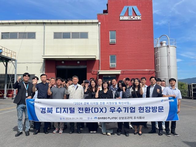 지난 24일 디지털전환 우수기업인 삼보프라텍에서 ‘경북 우수 디지털 전환(DX) 제조기업 벤치마킹 교육’을 진행하고 기념촬영하고 있다.