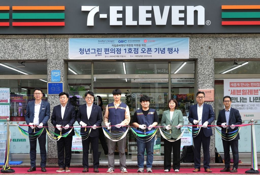 세븐일레븐은 25일 오후 경기도 안양시에 자립준비청년의 창업 및 취업 활동을 돕는 ‘세븐일레븐 청년그린 편의점 1호점(안양석수점)’을 열고 각 사 주요 관계자들이 참석한 가운데 오픈 기념식을 진행했다고 26일 밝혔다.