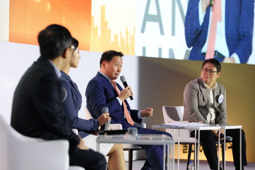 최태원 SK그룹 회장(왼쪽에서 3번째)이 25일 울산전시컨벤션센터에서 열린 ‘2024 울산포럼’ 폐회식에 참석해 기술과 문화를 활용한 울산의 혁신방안에 대해 설명하고 있다. (사진 출처= SK 제공)