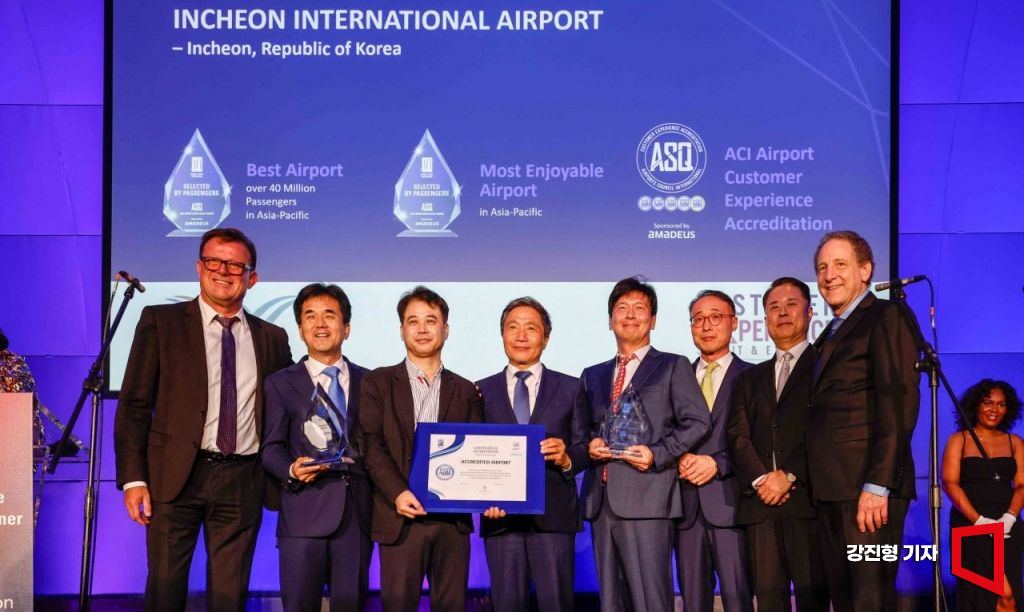 이학재(왼쪽 네 번째) 인천국제공항공사 사장이 현지시각 25일 미국 애틀랜타 조지아 아쿠아리움 오션스볼룸에서 열린 '제6회 ACI 고객경험 글로벌 써밋'에 참석해 고객경험 인증 5단계 인증패를 수상한 뒤 기념촬영을 하고 있다. 이날 인천공항은 전 세계 공항 최초 고객경험 인증 5단계(최고 단계)를 3년 연속 획득 했으며, ASQ(세계공항서비스평가)의 ‘올해의 공항상(Best Airport)’, ‘가장 즐거운 공항상(Most Enjoyable Airport)’ 수상의 쾌거를 이루었다. 왼쪽부터 루디 다니엘로 아마데우스사 공항운영부문 부사장, 권혁진 서울지방항공청장, 장기호 인천국제공항공사 노동조합위원장, 이학재 인천국제공항공사 사장, 장성환 인천국제공항공사 비상임이사 의장, 김종민 인천공항 출입국외국인청장, 노성재 대한항공 인천공항지점장, 저스틴 엘바치 ACI 사무총장. 사진=강진형 기자aymsdream@