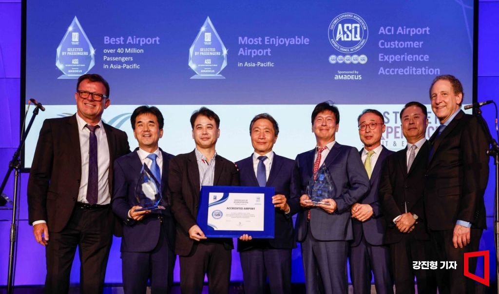 이학재(왼쪽 네 번째) 인천국제공항공사 사장이 현지시각 25일 미국 애틀랜타 조지아 아쿠아리움 오션스볼룸에서 열린 '제6회 ACI 고객경험 글로벌 써밋'에 참석해 고객경험 인증 5단계 인증패를 수상한 뒤 기념촬영을 하고 있다. 이날 인천공항은 전 세계 공항 최초 고객경험 인증 5단계(최고 단계)를 3년 연속 획득 했으며, ASQ(세계공항서비스평가)의 ‘올해의 공항상(Best Airport)’, ‘가장 즐거운 공항상(Most Enjoyable Airport)’ 수상의 쾌거를 이루었다. 왼쪽부터 루디 다니엘로 아마데우스사 공항운영부문 부사장, 권혁진 서울지방항공청장, 장기호 인천국제공항공사 노동조합위원장, 이학재 인천국제공항공사 사장, 장성환 인천국제공항공사 비상임이사 의장, 김종민 인천공항 출입국외국인청장, 노성재 대한항공 인천공항지점장, 저스틴 엘바치 ACI 사무총장. 사진=강진형 기자aymsdream@