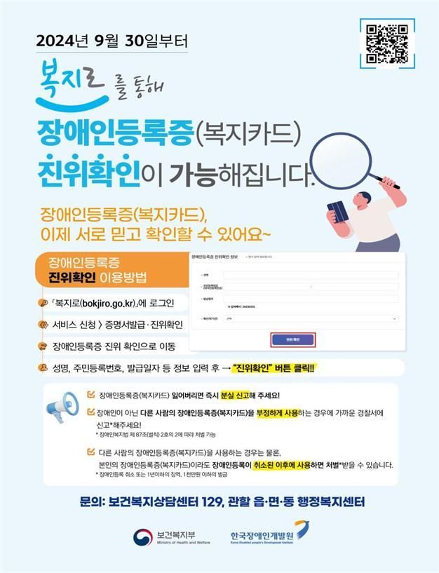 황승현 복지부 장애인정책국장은 "장애인등록증 진위 확인 서비스를 통해 부정수급을 막을 수 있을 뿐만 아니라 장애인등록증으로 수급 자격을 확인받는 장애인의 편의도 제고될 것으로 기대한다"고 말했다.