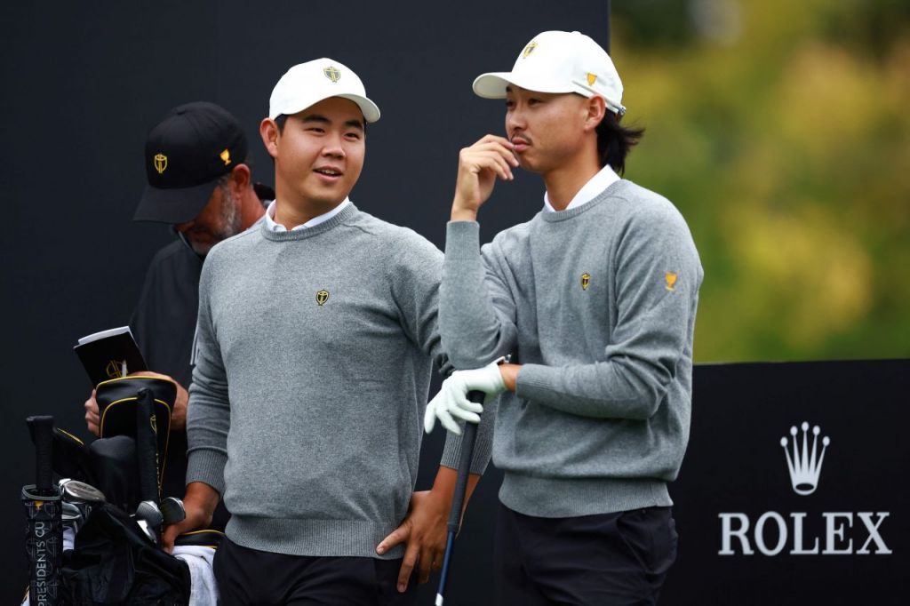 인터내셔널팀 김주형(왼쪽)과 이민우가 2024 프레지던츠컵 연습라운드에서 이야기를 하고 있다. [몬트리올=AFP·연합뉴스