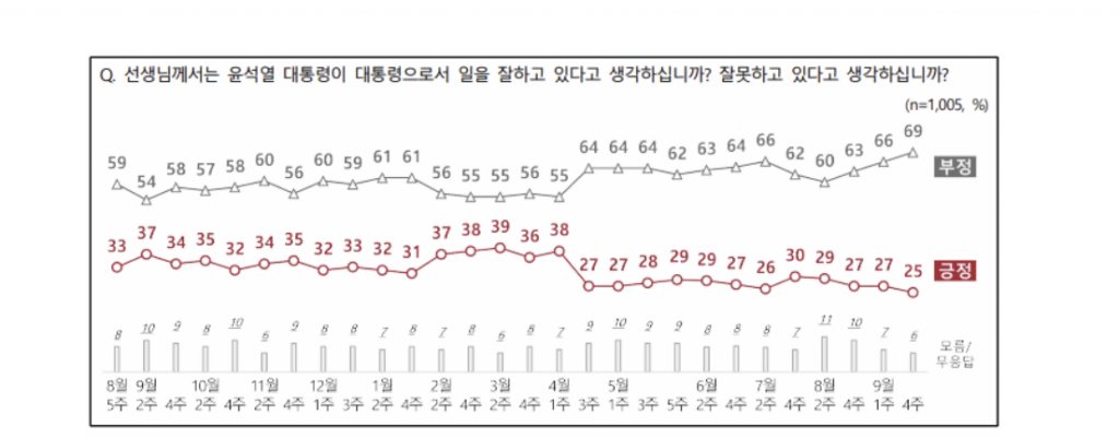 엠브레인퍼블릭·케이스탯리서치·코리아리서치·한국리서치가 지난 23일~25일까지 3일간 전국 만 18세 이상 남녀 1005명을 대상으로 진행한 전국지표조사(NBS)에서 윤 대통령이 국정 운영을 '잘하고 있다'는 평가는 25%, '잘못하고 있다'는 69%로 나타났다.