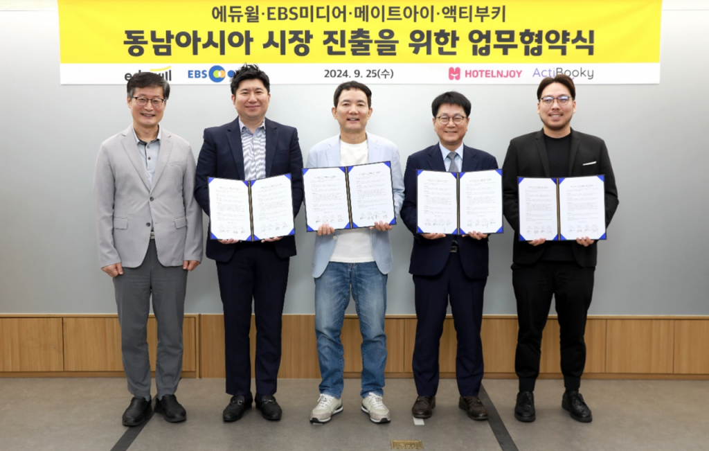 25일 에듀윌 본사에서 진행된 협약식에는 양형남 에듀윌 대표, 박성호 EBS미디어 대표, 김민수 메이트아이 대표, 이동원 액티부키 대표와 이정협 라오스 산업통상부 경제자문관 등 관계자들이 참석했다. 4개사는 한국의 선진 교육 시스템과 풍부한 콘텐츠 역량을 동남아시아 시장에 접목해 새로운 성장 동력을 확보할 계획이다.