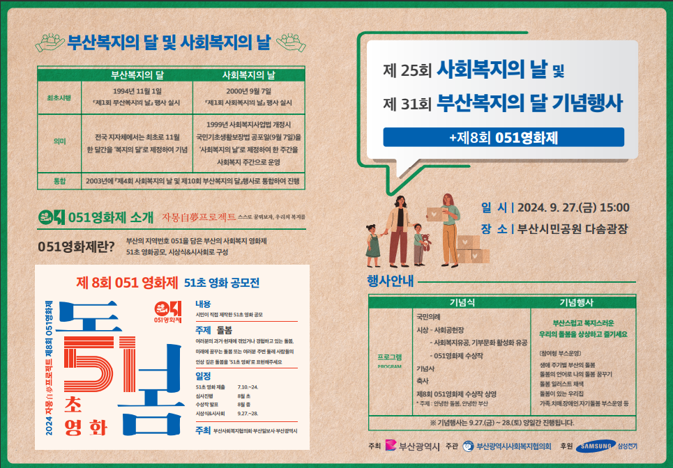 부산시는 27일 오후 3시 부산시민공원 야외무대에서 '제25회 사회복지의 날'과 '제31회 부산복지의 달'을 맞아 기념행사를 개최한다.