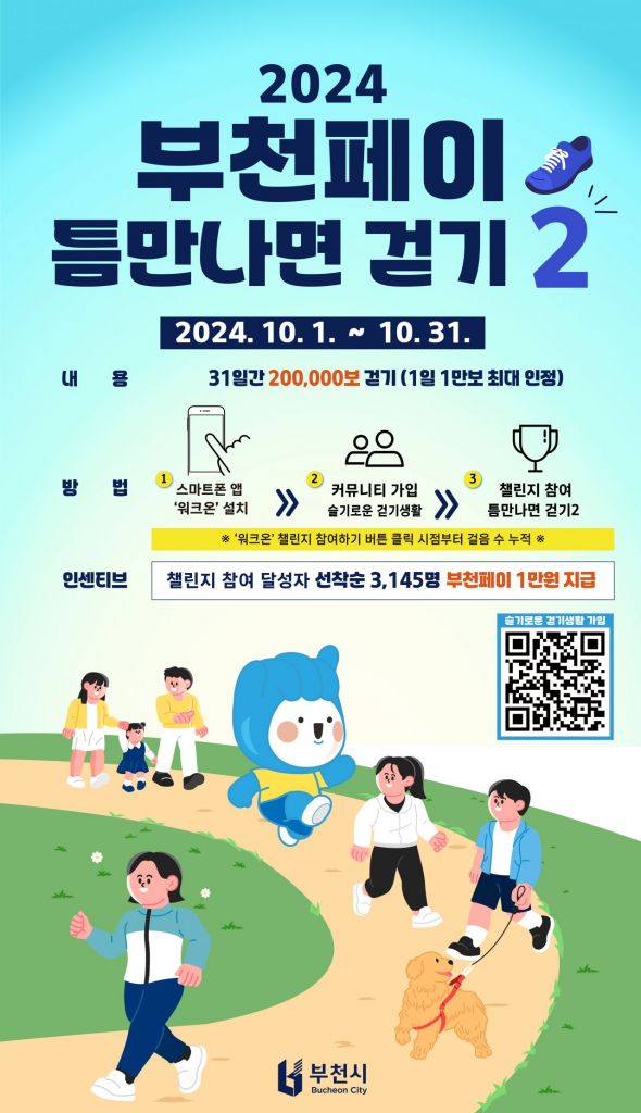 경기 부천시는 다음 달 1일부터 31일까지 지역화폐인 부천페이 카드를 소지한 시민을 대상으로 비대면 걷기 챌린지 '틈만나면 걷기2'를 진행한다.