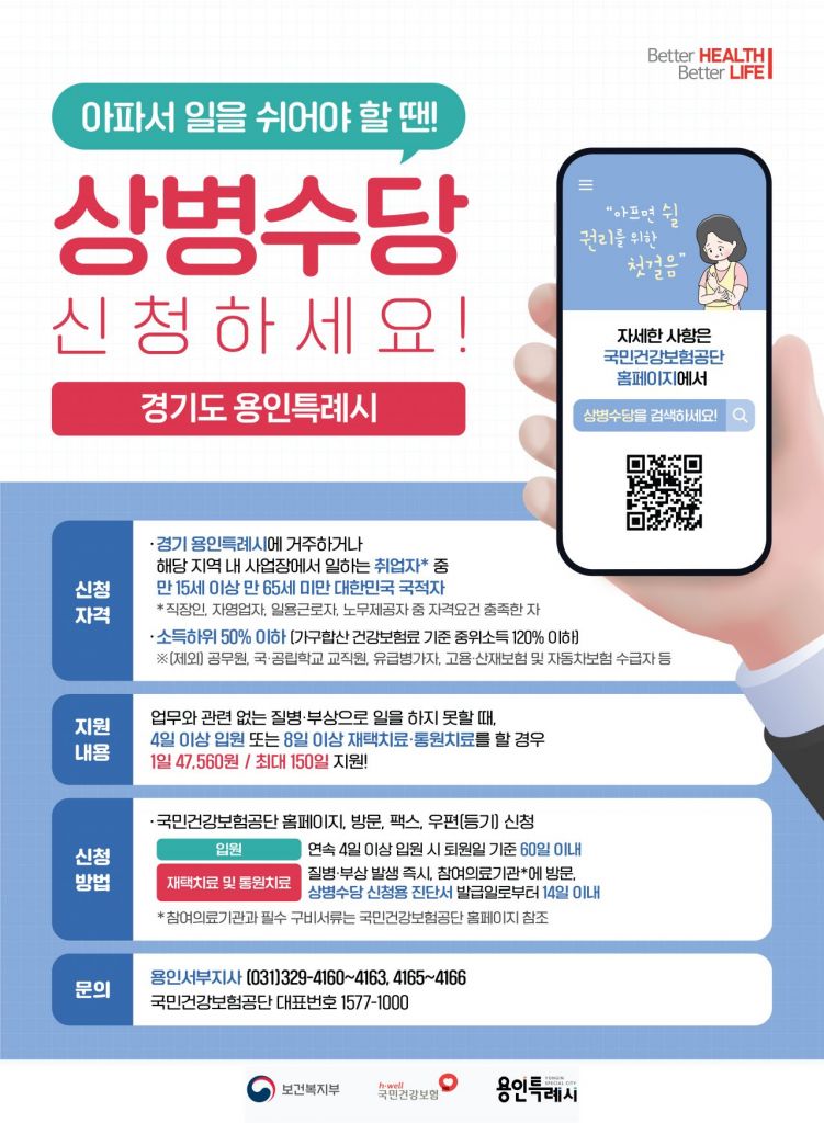 '상병수당'은 근로자가 업무와 관련 없는 질병이나 부상으로 일을 하지 못할 때 치료에 집중할 수 있도록 최저임금의 60%를 지급하는 제도다. 지원 대상은 15세 이상 65세 미만의 기준중위소득 120%(소득 하위 50%) 이하 근로자다.