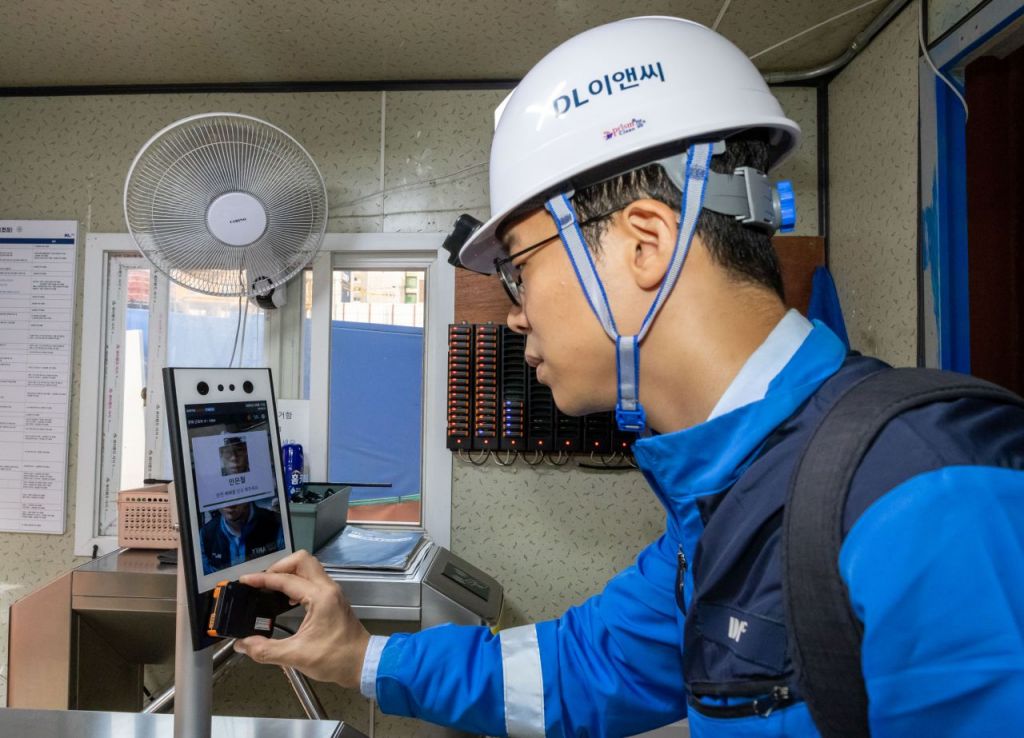 DL이앤씨 근로자가 안전삐삐를 지급받은 후 안면인식 시스템을 거쳐 현장에 출입하고 있다. / 사진제공=DL이앤씨