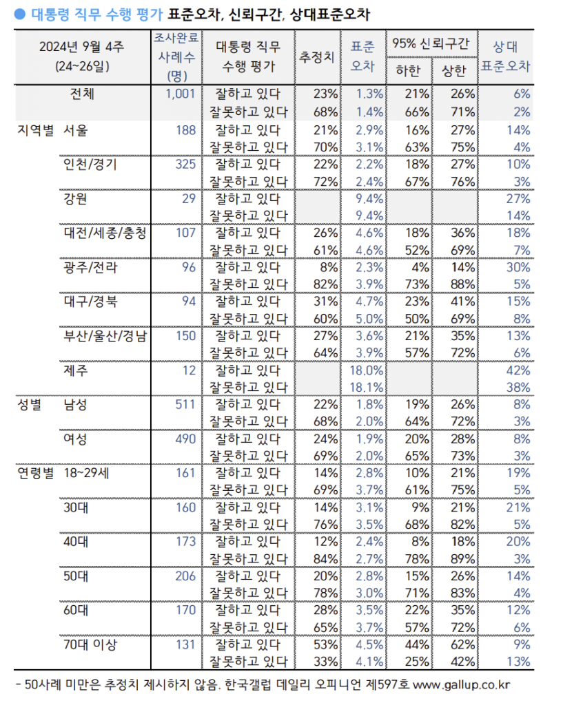 지역별로는 서울에서 긍정 및 부정 평가율이 각각 23%와 68%로 집계됐다. 인천·경기 21%와 70%, 대구·경북은 31%와 60%로 각각 집계됐다. 부산·울산·경남 지역은 27%와 64%, 대전·세종·충청은 26%와 61%, 광주·전라는 각각 8%와 82% 등으로 나타났다.