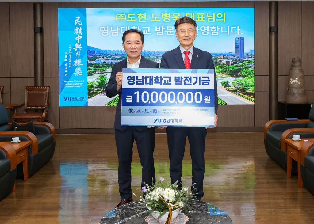 27일 노병욱 대표가 영남대를 찾아 최외출 총장에게 새마을국제개발학과 학생 지원을 위해 써달라며 1000만 원을 전달했다. 노 대표는 금속 표면 처리 및 관련 기술 전문기업 (주)도현의 대표를 맡고 있으며, 꾸준한 기술 개발과 품질 관리를 통해 금속 표면 처리 업계에서 신뢰받는 기업으로 성장시켜 왔다. 또한 지역 인재 육성을 위해 성주군 내 학교에 장학금을 지원하고 고향사랑 기부제를 통해 기부 활동을 하는 등 지역사회를 위한 공헌 활동에도 적극적으로 참여해 오고 있다.