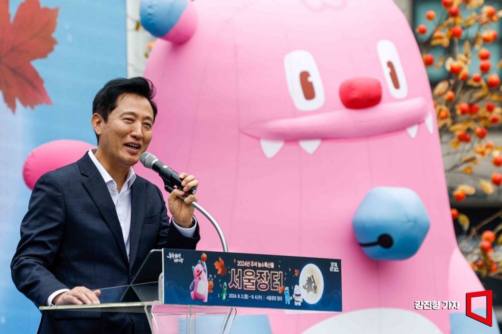 오세훈 서울시장이 2일 서울 중구 서울광장에서 열린 '2024년 추석 농수특산물 서울장터 개막식'에 참석해 인사말 하고 있다. 서울시는 9월 2∼4일 서울광장에서 '2024 추석 농수특산물 서울장터'를 연다고 지난달 29일 밝혔다.올해는 11개 광역 자치단체 및 104개 시·군 농가가 참여하며, 우수 농수특산물을 최대 30%까지 저렴하게 구매할 수 있다. 사진=강진형 기자aymsdream@