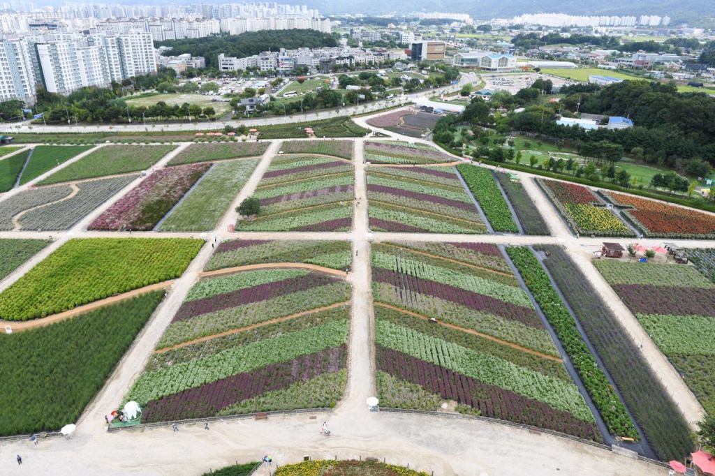 6만 6000㎡의 나리농원에는 바둑판 모양으로 조성된 꽃밭에 천일홍, 칸나, 핑크뮬리 등이 만개해 꽃물결로 장관을 이루고 있다.