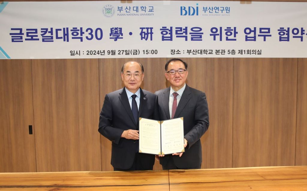 부산대학교는 부산연구원과 27일 교내 대학본부에서 ‘글로컬대학30 學·硏(학·연) 협력에 관한 업무협약’을 체결했다.