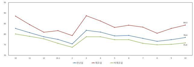 제조업의 10월 경기전망은 전월대비 1.6p 상승한 84.3이며, 비제조업은 전월대비 0.7p 상승한 75.9로 나타났다. 건설업(72.2)은 전월대비 1.0p 하락했으며, 서비스업(76.7)은 전월대비 1.1p 상승했다.