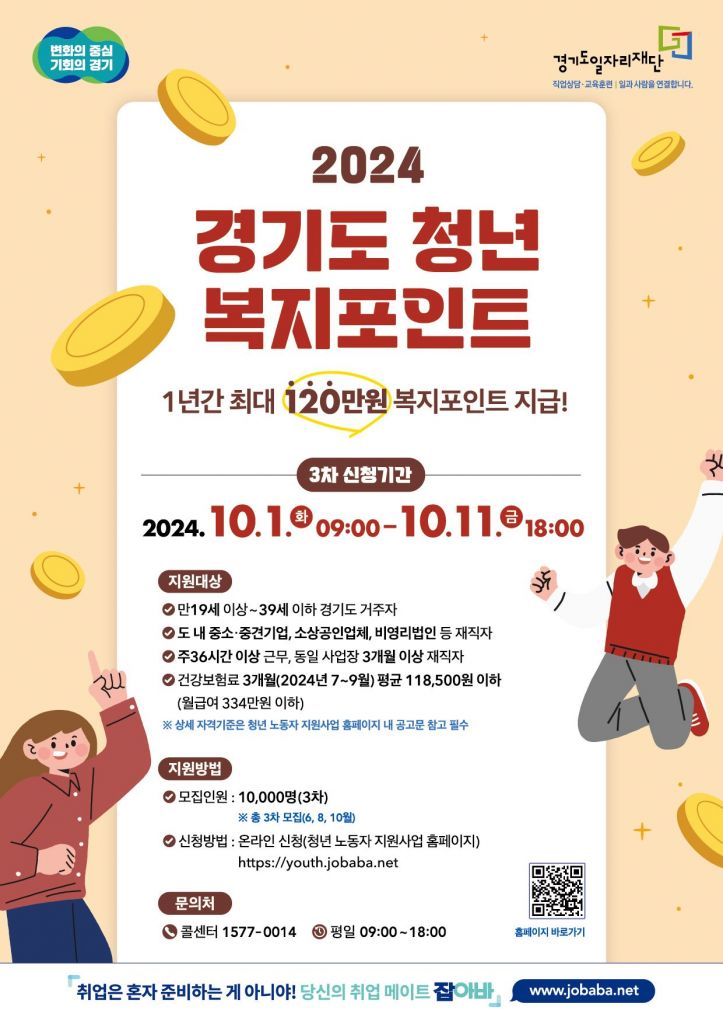 경기도가 청년 노동자의 복리후생 개선과 일자리 미스매치 해소를 위한 ‘청년 복지포인트’ 지원사업의 3차 참여자 1만명을 10월1일부터 11일까지 모집한다.