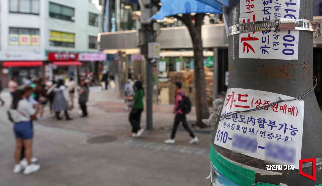 경기 불황 속에서 은행 등 1금융권의 대출 문턱이 높아지면서 카드론과 현금서비스 규모가 역대 최대를 기록한 것으로 나타난 30일 서울 중구 명동거리에 카드 대출 관련 광고물이 붙어 있다.