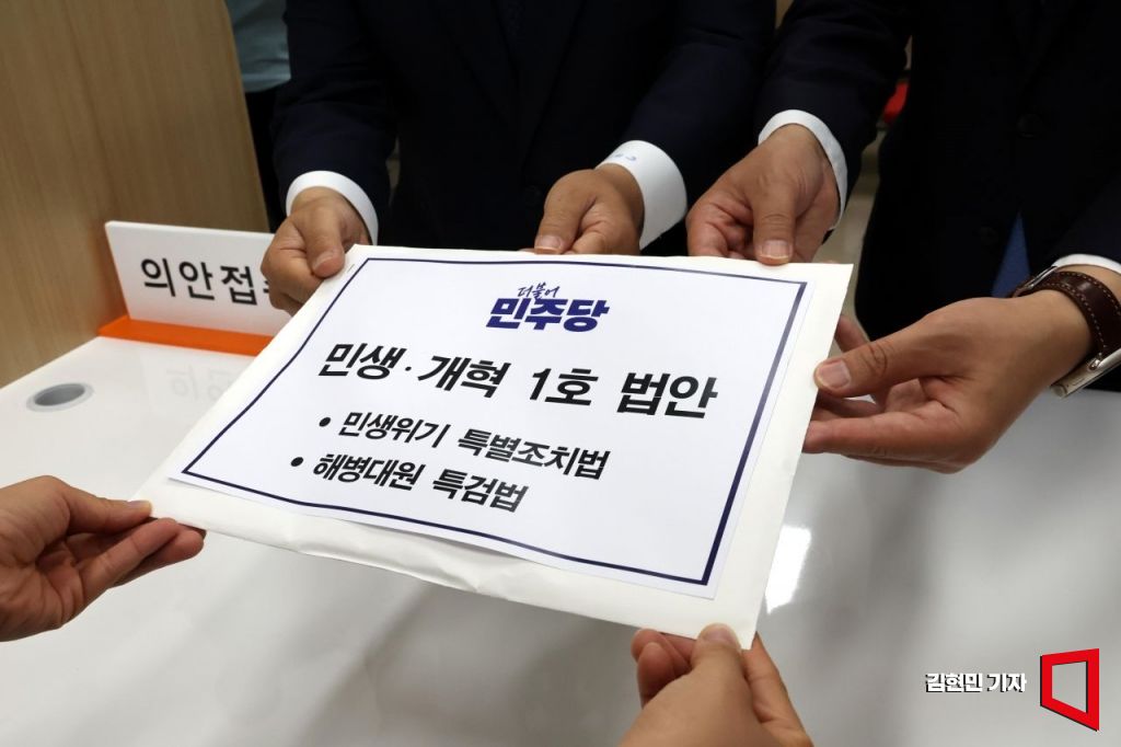 22대 국회 개원 첫 날인 30일 국회 의안과에서 더불어민주당 민병대(왼쪽), 김용민 의원이 더불어민주당 당론 1호 법안인 ‘해병대 특검법, 민생위기 특별 조치법’을 제출하고 있다. 사진=김현민 기자 kimhyun81@