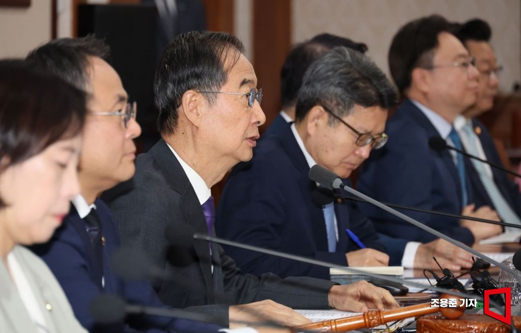 한덕수 국무총리가 30일 서울 종로구 정부서울청사에서 열린 국무회의에 참석, 발언하고 있다. 이날 회의에선 국회 본회의에서 야당이 강행 처리한 '김건희 여사 특검법', '해병대 채 상병 특검법' 등 3개 법안에 대한 재의요구권(거부권)을 심의, 의결할 예정이다. 사진=조용준 기자 jun21@