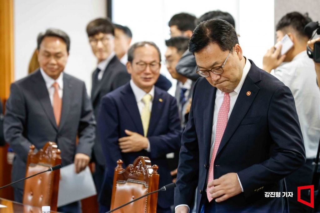 김병환 금융위원회 위원장이 30일 서울 중구 은행회관에서 열린 '금융지주회장 간담회'에 참석한 금융지주회장들과 사진촬영을 마친 뒤 자리로 이동하고 있다.