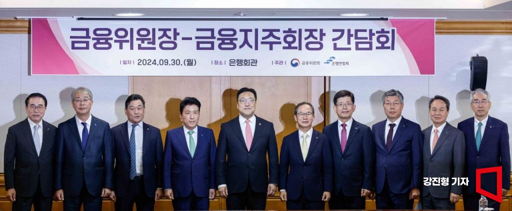 김병환(왼쪽 다섯 번째) 금융위원회 위원장이 30일 서울 중구 은행회관에서 열린 '금융지주회장 간담회'에 참석한 금융지주회장들과 사진촬영 하고 있다.