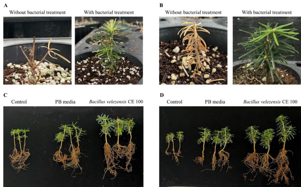 이에 산림과학원과 안 교수 연구팀은 고사한 구상나무 어린나무의 RNA 분석과 접종 등으로 구상나무에 치명적인 병원균 2종을 확인, 구상나무 병원균 접종묘에 미생물을 처리하는 실험을 진행했다.