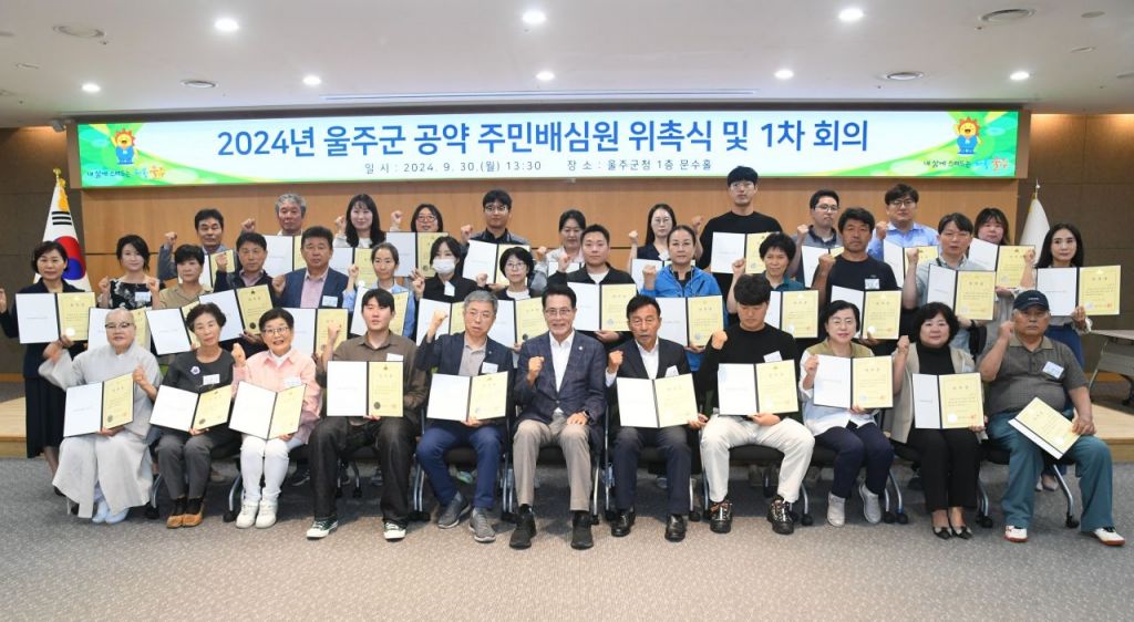 울산시 울주군이 30일 민선 8기 공약 이행사항 점검과 공약 조정안건 심의를 위한 ‘2024년 울주군 공약 주민배심원 위촉식과 1차 회의’를 개최했다.