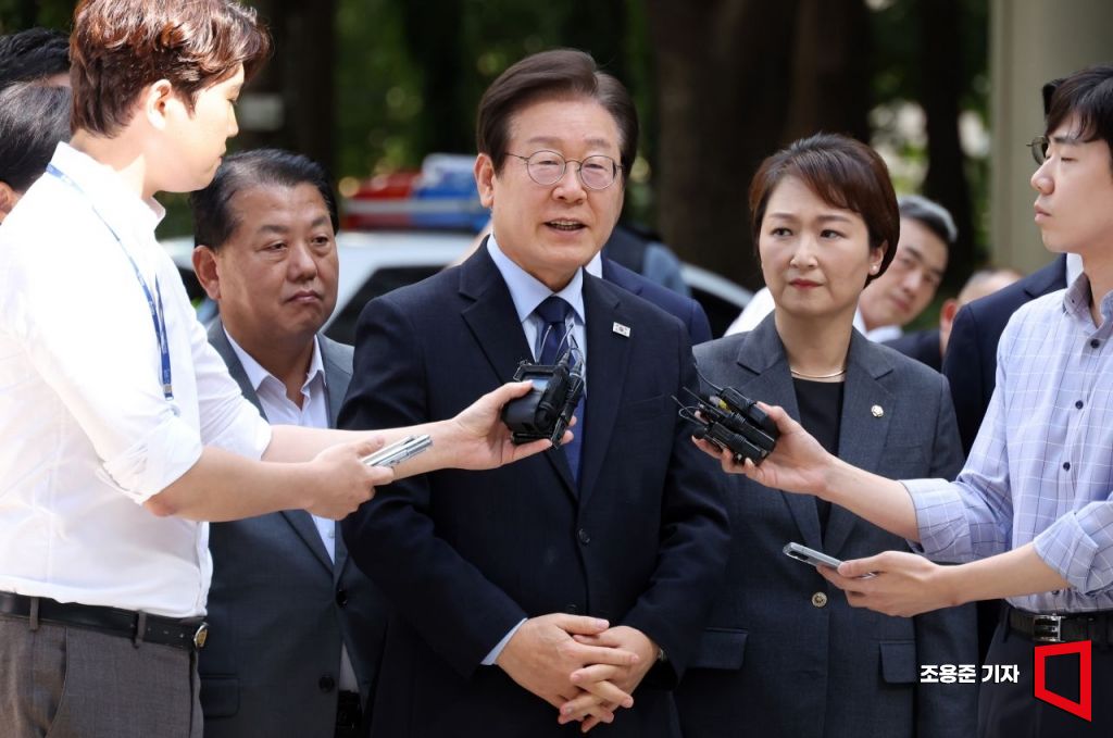 이재명 더불어민주당 대표가 30일 서울 서초구 중앙지방법원에서 열린 위증교사 혐의에 대한 1심 결심공판에 출석, 취재진 질문에 답하고 있다. 사진=조용준 기자 jun21@
