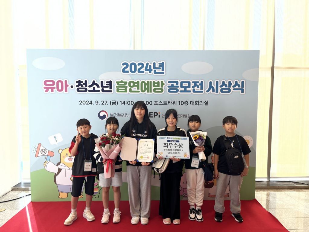 경남 양산시 웅상청소년방과후아카데미가 27일 서울 중구 포스트타워에서 진행된 ‘2024년 유아·청소년 흡연예방 공모전’ 초등고학년 영상 부문에서 최우수상을 받았다.