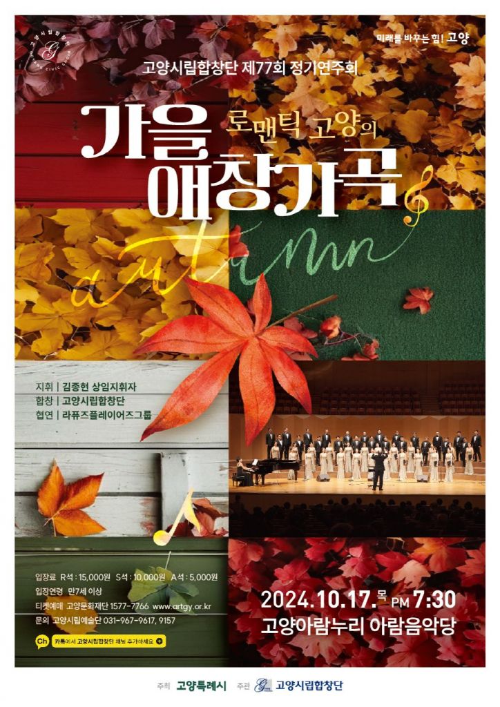 경기 고양특례시(시장 이동환)를 대표하는 문화예술단체인 고양시립합창단(지휘 김종현)의 제77회 정기연주회 '로맨틱 고양의 가을 애창 가곡'이 오는 10월 17일 저녁 7시 30분에 고양아람누리 아람음악당에서 개최한다.