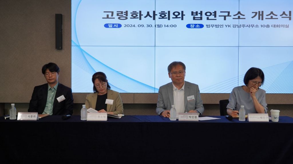 1일 법조계에 따르면 법무법인 YK가 전날 ‘고령화사회와 법 연구소’ 개소식을 기념해 '고령화 사회와 상속'을 주제로 법무법인 YK 강남 주사무소에서 개최한 심포지엄에서 전문가들은 신탁제도와 후견계약을 포함한 법적 장치들은 고령자의 경제적 및 신체적 취약성을 보완하며 안정된 노후 생활을 보장하는 필수적인 수단이 될 것이라고 강조했다.
