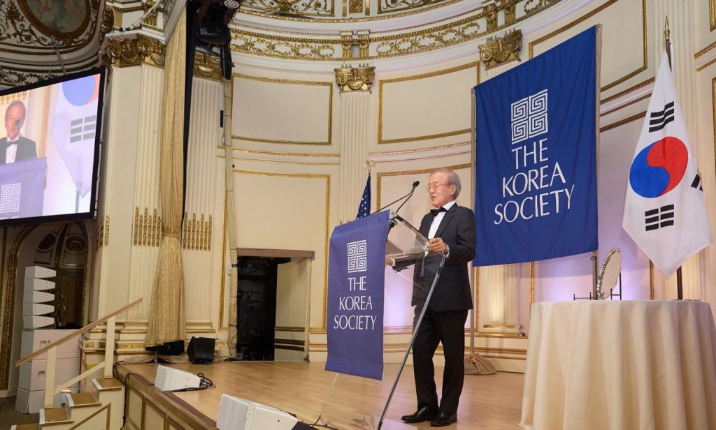 윤윤수 휠라홀딩스 회장이 지난달 30일(현지시간) 미국 뉴욕 맨해튼 플라자 호텔에서 열린 밴 플리트 상 시상식에서 소감을 말하고 있다. [사진제공=휠라홀딩스]