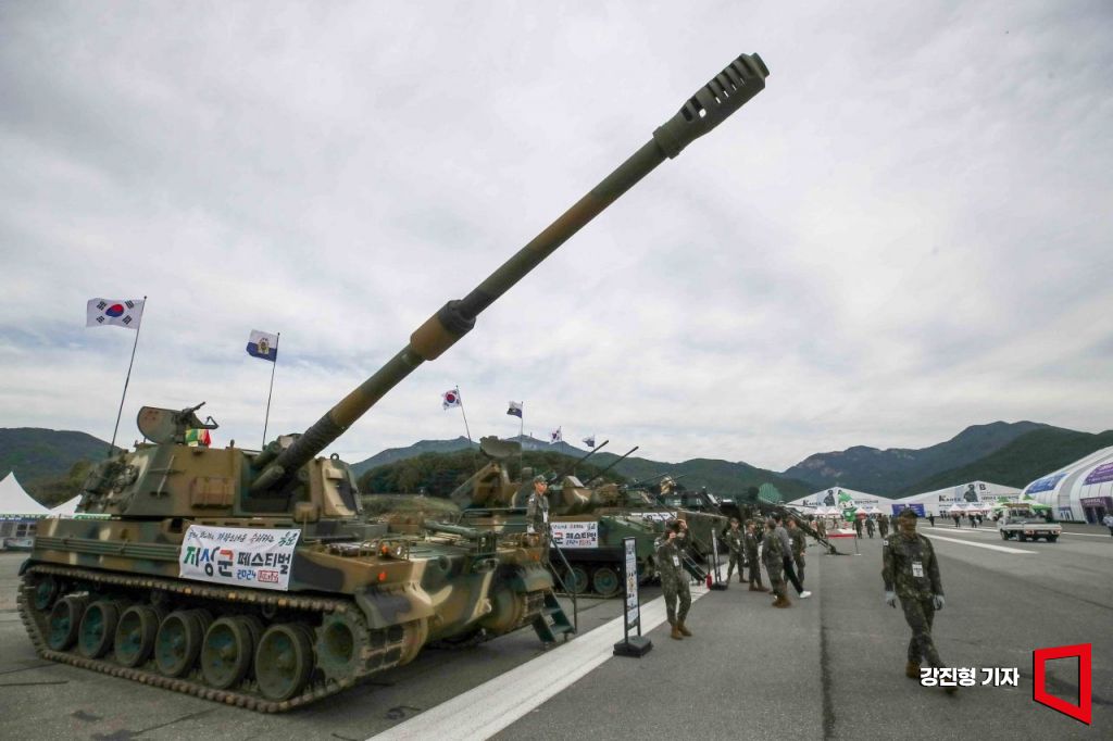 2일 충남 계룡대에서 열린 '대한민국 국제방위산업전시회'에서 K9A1 자주곡사포가 전시돼 있다.