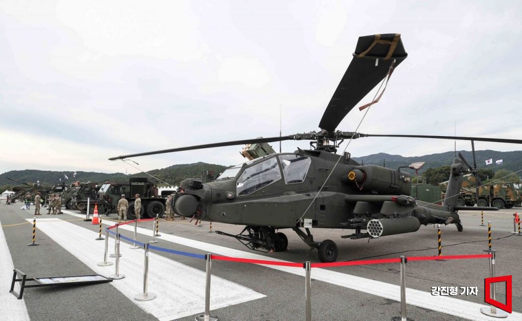 2일 충남 계룡대에서 열린 '대한민국 국제방위산업전시회'에서 대형 공격헬기(AH-64E)가 전시돼 있다.