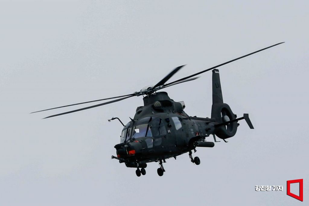 2일 충남 계룡대에서 열린 '대한민국 국제방위산업전시회'에서 소형무장헬기(LAH)가 시험비행 하고 있다.