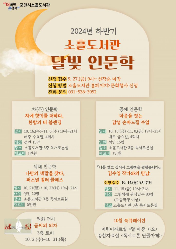 한편, 소흘도서관 ‘달빛 인문학 프로그램’과 관련된 자세한 내용은 포천시 도서관정책과 도서관 운영1팀 프로그램 담당자에게 문의하면 된다.