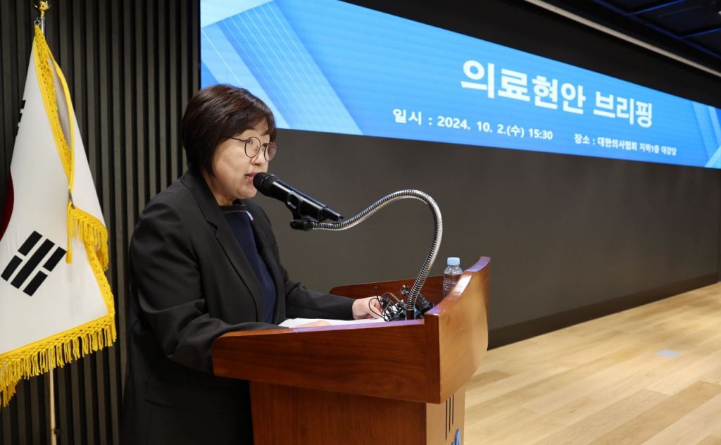 최안나 대한의사협회 대변인이 2일 오후 서울 용산구 의협회관에서 의협과 대한의학회, 전국의과대학교수협의회, 전국의대교수비상대책위원회, 한국의과대학·의학전문대학원협회의 의대정원 증원 논의에 대한 공동 입장을 발표하고 있다.[이미지출처=연합뉴스]