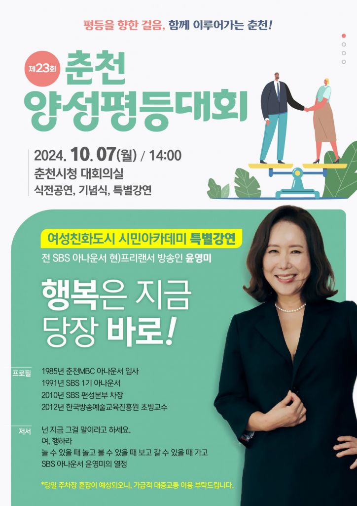 올해 춘천양성평등대회는 1부 기념식과 2부 시민아카데미로 꾸며진다. 1부 기념식은 샌드아트오프닝 공연을 시작으로 양성평등헌장 낭독, 유공자 표창, 성별·연령별로 시민대표가 참여한 가운데 주제 퍼포먼스가 진행된다. 2부 시민아카데미는 전 SBS 아나운서 윤영미가 '행복은 지금, 당장 바로' 라는 주제로 특강을 한다.