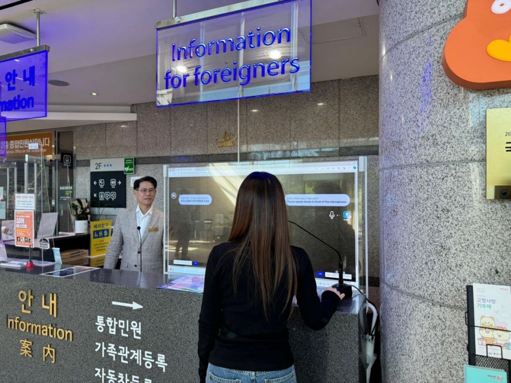 구는 최근 구청 2층 종합민원실 안내대에 동시통역 서비스 이용이 가능한 55인치 터치식 양방향 투명 모니터를 설치했다. 9월 한 달간 시범운영을 거쳐 이달부터 정식 운영에 들어갔다.