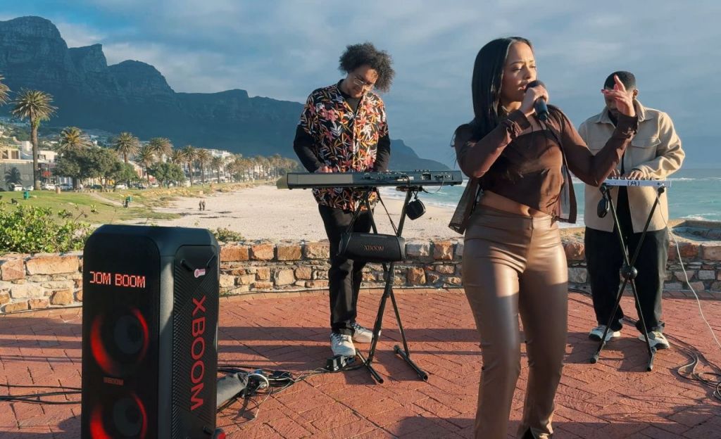 아티스트들이 해변을 배경으로 LG전자의 대형 무선 스피커 '엑스붐(XBoom)'을 사용해 거리 공연을 펼치고 있다.. [사진제공=LG전자]