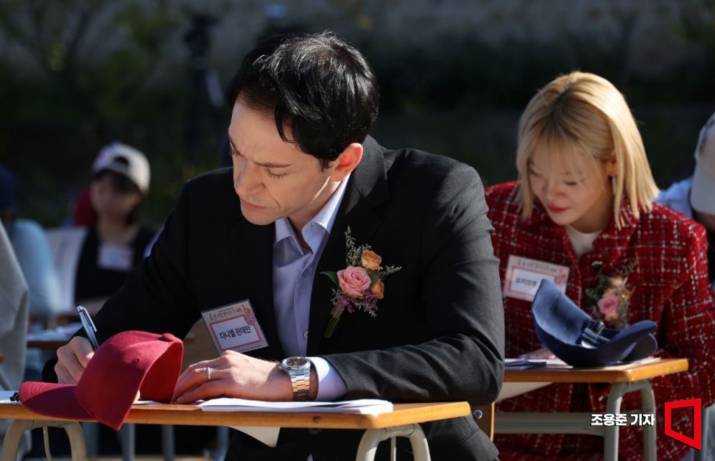 제578돌 한글날을 기념하는 '2024 한글주간(4일~10일)' 개막일인 4일 서울 경복궁 흥복전에서 열린 '전국민 받아쓰기 대회'에 일본 출신 방송인 후지모토 사오리(오른쪽)와 독일 출신 방송인 다니엘 린데만이 제시문을 답안지에 적고 있다. 사진=조용준 기자 jun21@